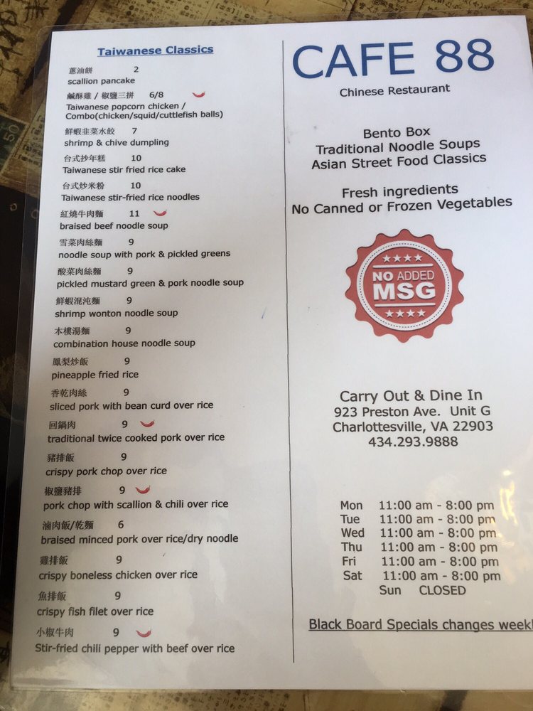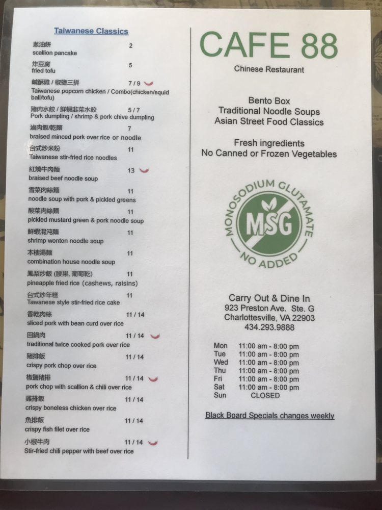 Introducing Cafe 88, a Chinese restaurant located at 923 Preston Ave in Charlottesville, VA. This casual dining spot offers a variety of bento specials, dim sum & snacks, and soups. Standout bento specials include the Amazing Chicken with dark meat chicken in a spiced sauce, and the Japanese Omelet served with fried rice. For dim sum lovers, be sure to try the Crispy Chicken with spiced salt & basil, or the Crystal Steam Shrimp Dumpling. The menu also features classic soups like Egg Drop and Hot & Sour. Cafe 88 provides a vibrant dining experience with options for vegans and meat eaters alike. The atmosphere is perfect for a laid-back lunch or dinner, with options for outdoor seating and waiter service. Don't miss out on this gem - Cafe 88 is a must-try for Chinese cuisine enthusiasts.
